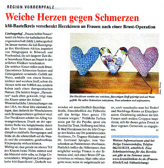 In 2015 konnten wieder Herzkissen "Der (Be-) Stechenden" an die Stadtklinik Frankenthal und den Verein "Frauen nach Krebs" übergeben werden.